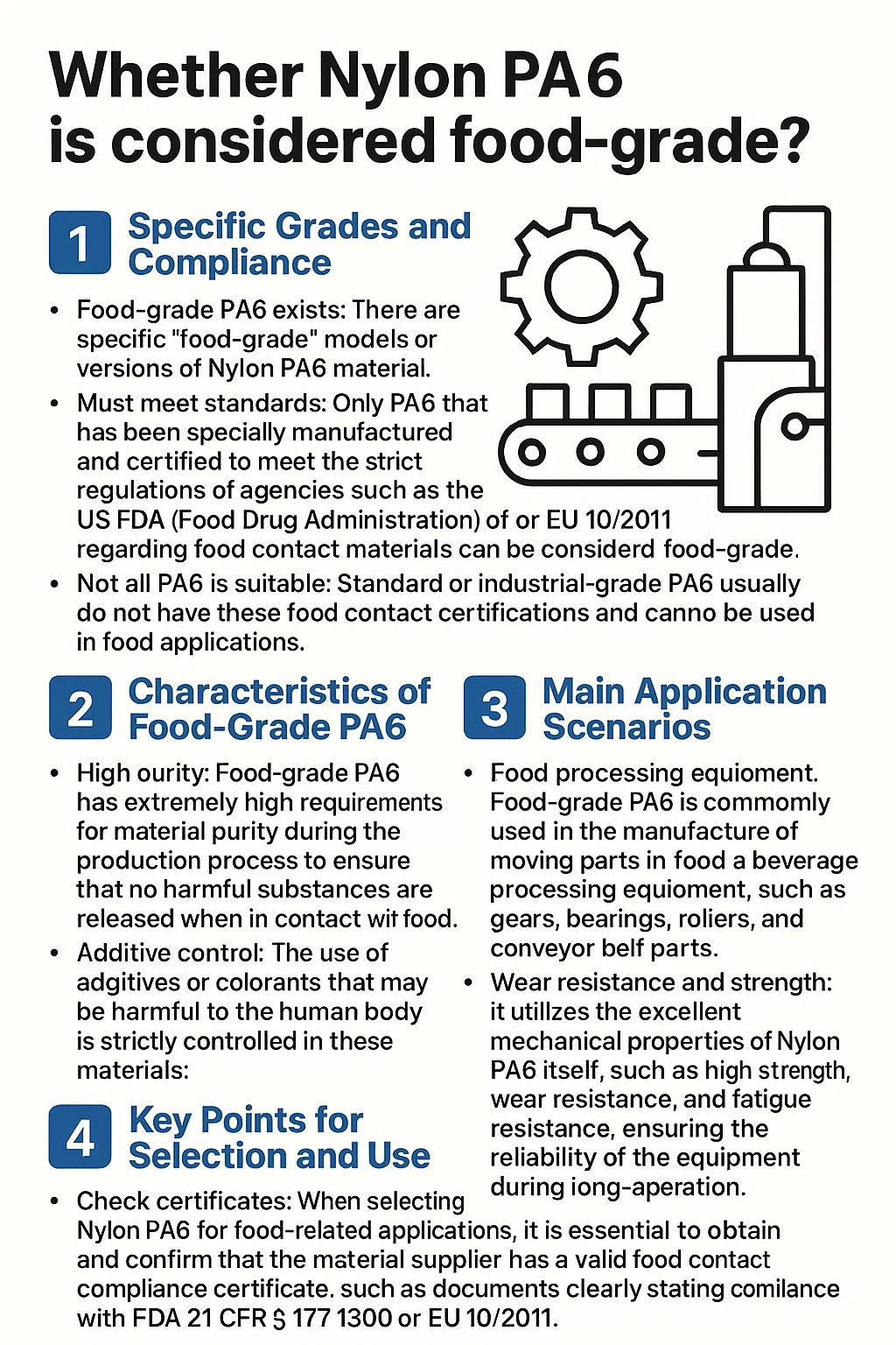 همه PA6 مناسب نیستند: PA6 استاندارد یا درجه صنعتی معمولاً این گواهینامه های تماس با مواد غذایی را ندارد و نمی توان از آن در برنامه های غذایی استفاده کرد.
