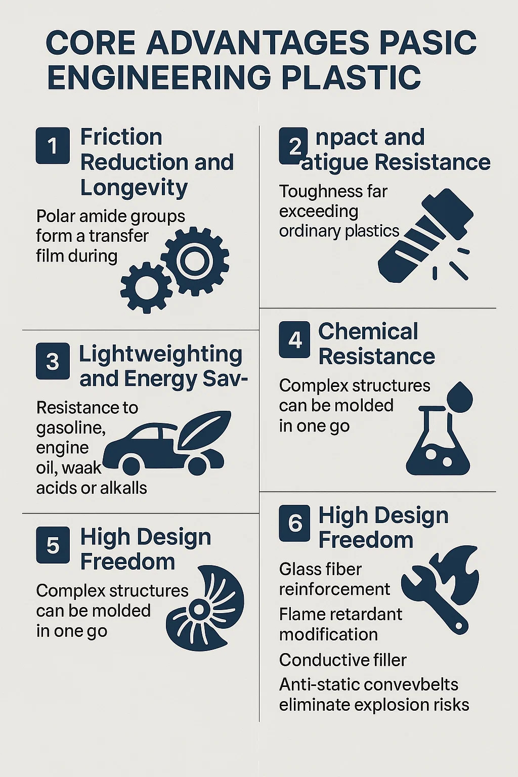 زنجیره مولکولی حاوی گروه های آمید قطبی است که در هنگام اصطکاک یک فیلم انتقال را تشکیل می دهند و به چرخ دنده ها و یاتاقان ها اجازه می دهند تا بدون نیاز به گریس خارجی ، برای دوره های طولانی کار کنند. در مقایسه با اجزای انتقال فلز ، نویز بیش از 30 ٪ کاهش می یابد و طول عمر پنج برابر افزایش می یابد.