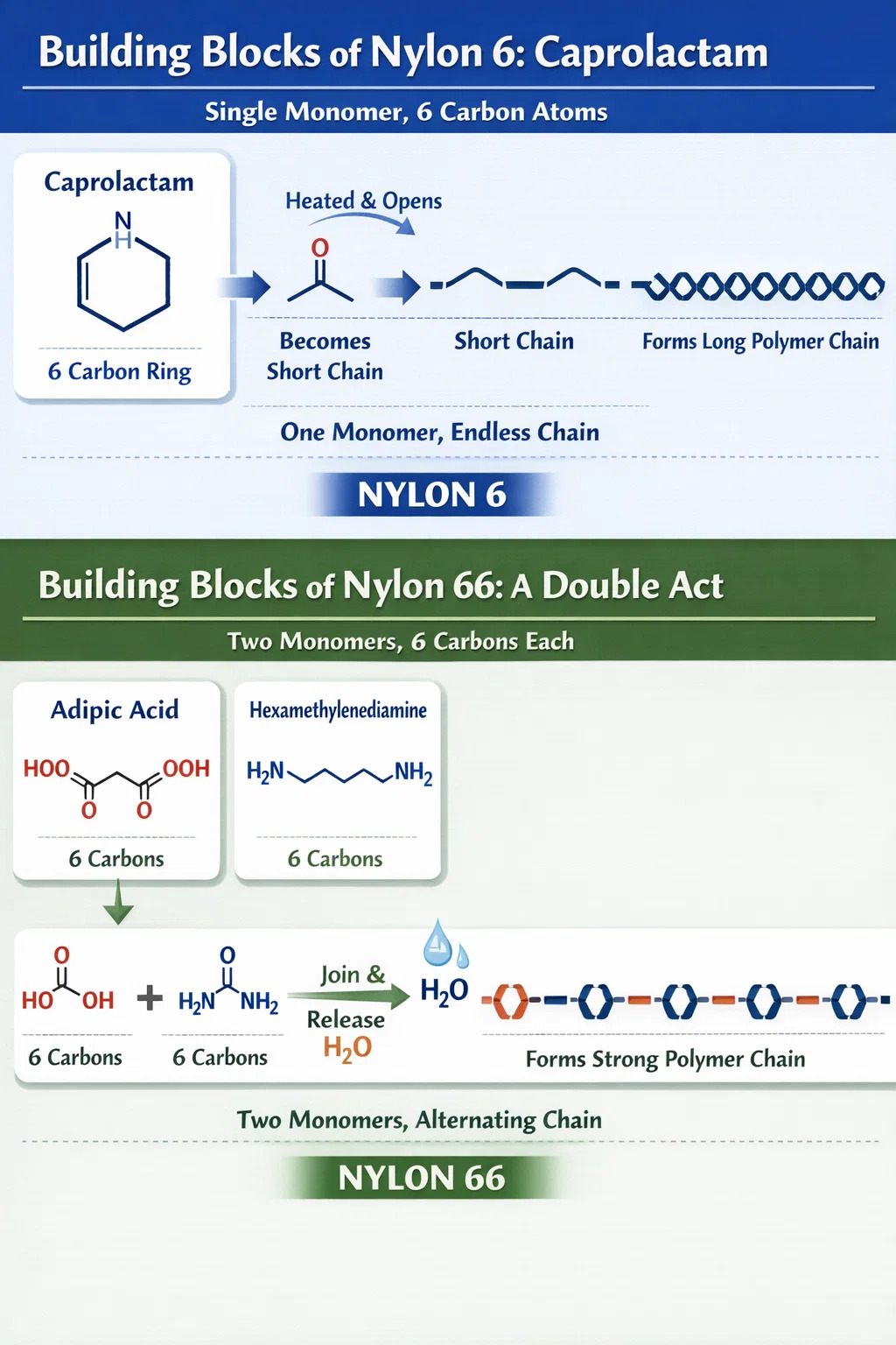 فرآیند ساخت: وقتی این دو ماده با هم مخلوط می شوند مانند قطب مثبت و منفی آهنربا یکدیگر را جذب می کنند. یک مولکول اسید آدیپیک به یک مولکول هگزا متیلن دی آمین می پیوندد و آنها یک مولکول آب را در طول اتصال "فشار" می کنند. آنها به طور متناوب به اتصال ادامه می دهند و یک زنجیره طولانی قوی تر تشکیل می دهند.