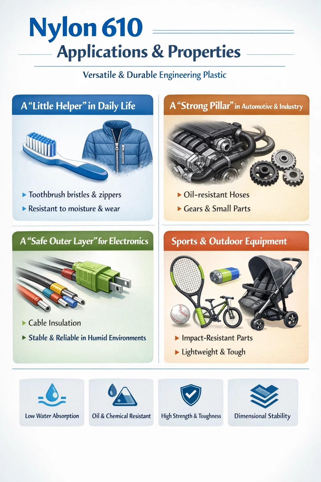 برس ها و الیاف: موهای مسواک و زیپ های لباس شما اغلب از نایلون 610 ساخته شده است. در مقایسه با معمولی نایلون 6 در محیطهای مرطوب عملکرد بهتری دارد، کمتر در معرض جذب آب و تغییر شکل است و موها حتی پس از استفاده طولانی مدت خاصیت ارتجاعی خود را حفظ میکنند و از نرم و شل شدن آنها جلوگیری میکنند.